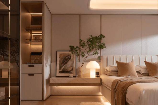 户型秉持“系统定制”为核心理念,从艺术家联名门把手到珍稀石材背景墙,肌理级的定制细节铭刻业主审美个性。