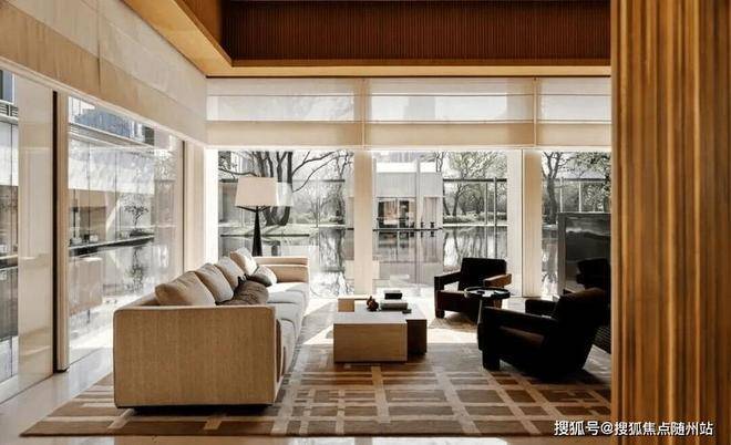 比如元素的统一和贯穿——景观和建筑都是通过维纳多等米黄色系的石材风格统一,而石材编织造型元素在整个公区里的贯穿,统一和贯穿,这也是豪宅高级感的营造方式之一。园林同样是大师出品——北京顺景园林,国际上屡获大奖。