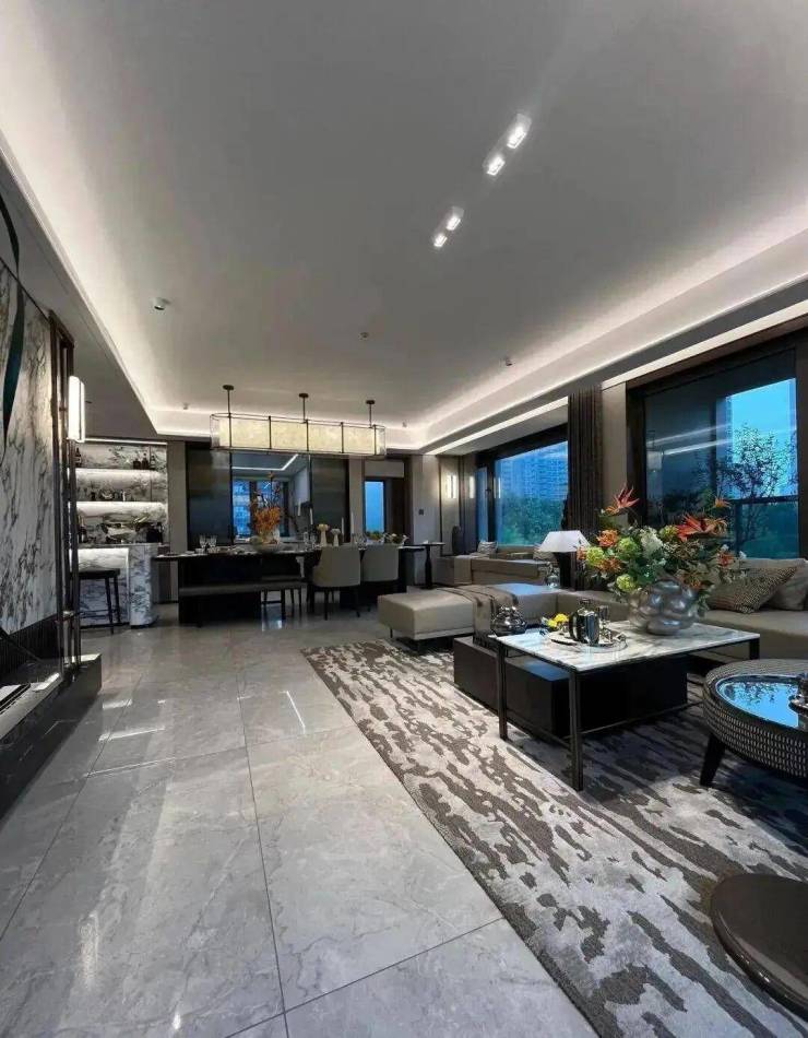 纵深超长的客餐厅,整个客厅做的是客餐厅一体化的设计,客厅空间足够大;两边落地窗,采光无敌视野通透