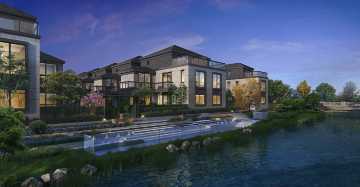 【上实·和风院】建筑外观是 新中式格调,以黑色面瓦为黛顶,整体线条简洁明快。