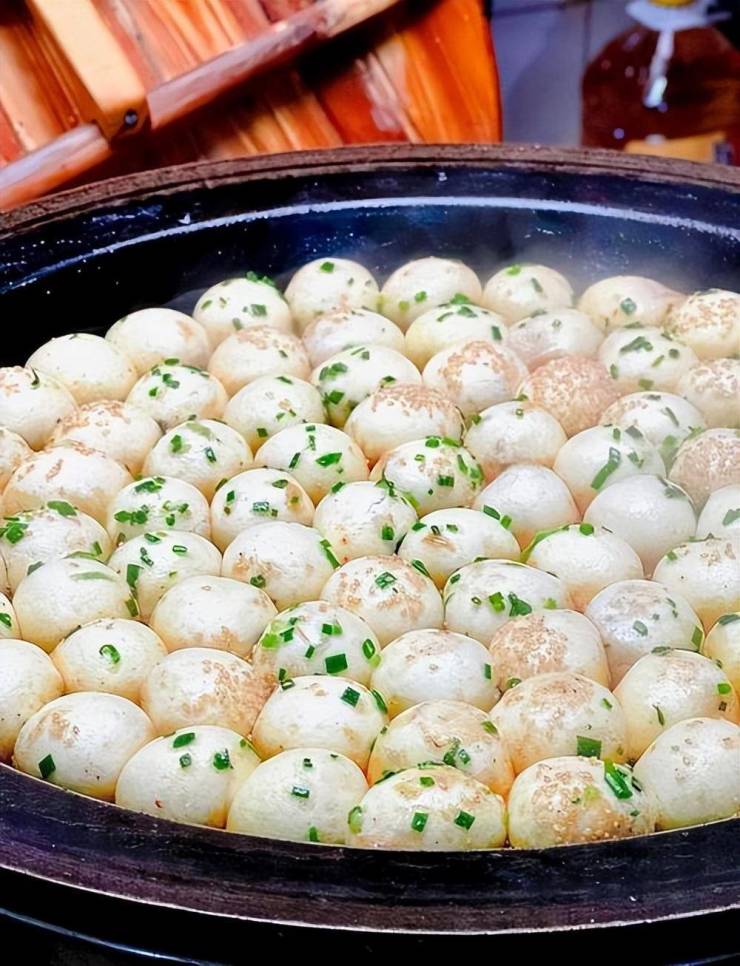 肉馅紧实不柴,带着少许皮冻熬出的汁水,顶部的芝麻和葱花增添了香气,一口下去,脆、香、鲜、甜样样都有,是苏州人早餐桌上的常客。