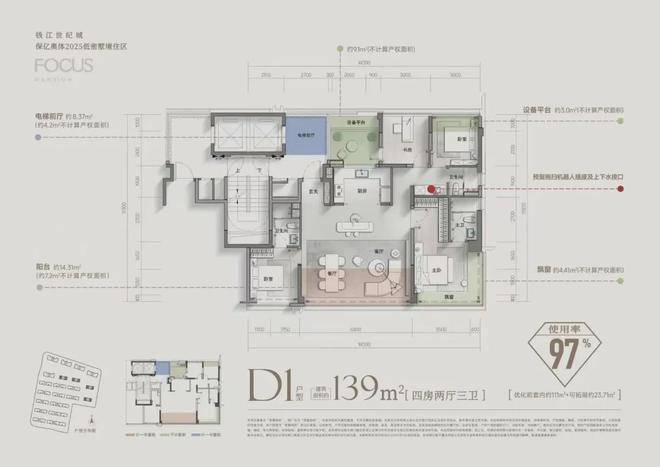 先看建面约139㎡四房三卫户型。LDKB的户型设计;封包阳台+主卧L型飘窗;双套卧、三卫;南向超大开间;专梯专户、尊享电梯前厅...