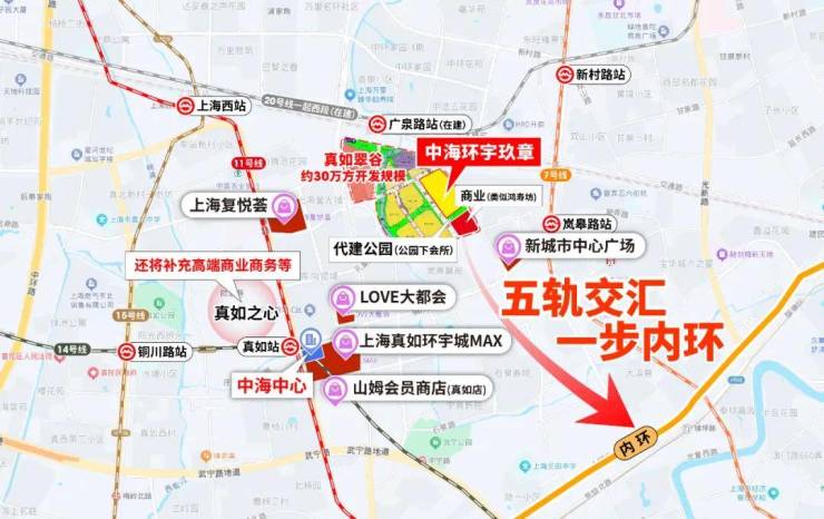 五轨交汇 四站直达静安寺:真如是上海罕见拥有 5 条轨交线的板块,目前7、11、14、15 号线已通车,20 号线预计 2028 年通车。从真如出发,4 站静安寺,5 站中山公园,6 站人民广场,半小时内即可覆盖上海核心商圈。路网方面,内环、中环、北横通道环绕,经曹阳路、武宁路可直达静安,无论是日常通勤还是周末出行,都极为便捷。