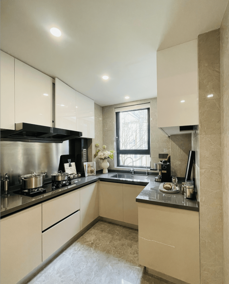 【人本厨房系统】U型厨房空间,符合人体工学设计,精选高仪或同等品牌厨盆、厨盆龙头,老板或同等品牌吸油烟机及灶具,令烹饪更舒适;