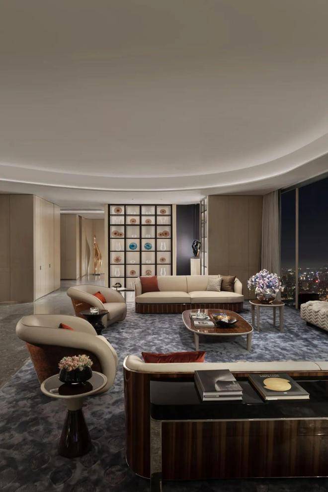 走道端处香槟色金属雕塑,形类城市高楼,又若恋人彼此依偎;全采光套房拥揽白日上海黄浦的忙碌、繁华,也收藏夜晚灯火阑珊的宁静、美好。