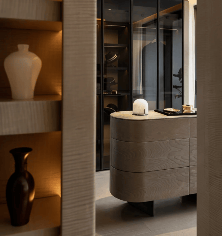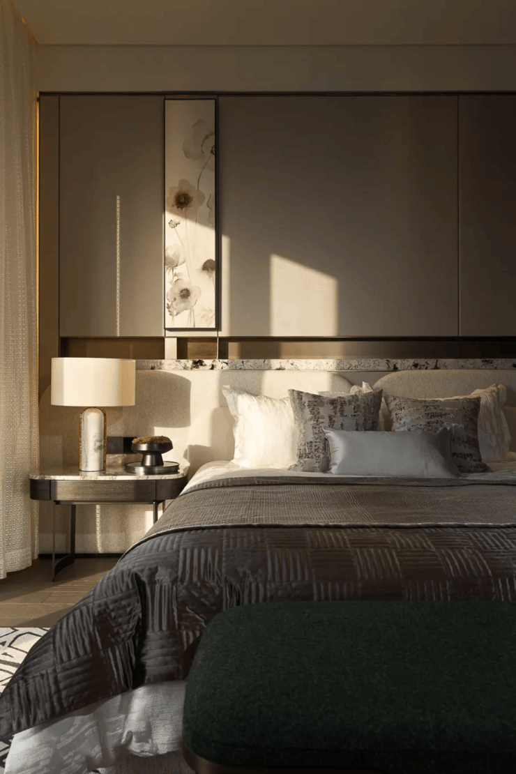 蓝灰色玻璃+仿石铝板+艺术涂料材质,穿插优雅线条,让建筑这张“脸”看起来更高级。One&Only酒店式门头。用雕塑体块、温润弧面和雅致线条,营造具有艺术格调的归家仪式感。