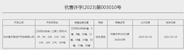 2023年03月19日杭州滨江春天阳光名城1、5、9、10、11、14-17、36幢领出预售证,预售证号:杭售许字(2023)第003010号。本批次为首开供应约230套70年产权住宅,建面77-212㎡户型,本批次清水单价¥13850-47310元/㎡,清水总价¥107.45-1005.67万,小高层清水均价¥19184元/㎡,联排清水均价36400元/㎡。
