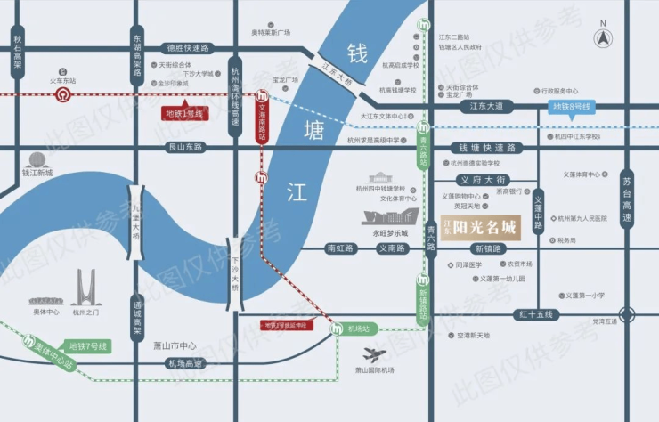 滨江阳光名城位于大江东核心十字轴位置,地处钱塘中轴线上。这里,交通便捷,地理位置优越,是连接主城与萧山国际机场的重要节点。项目周边,地铁、快速路交织,构成了四通八达的交通网络。