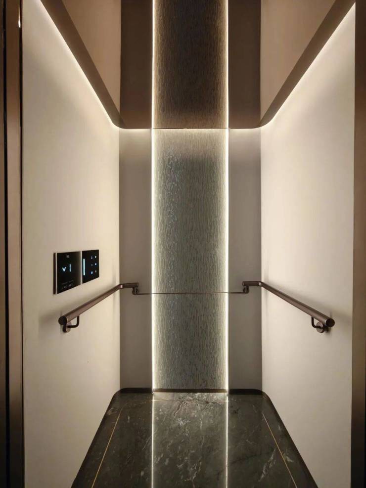 再来看看项目的样板间,还没有进入到样板间内就能感受到扑面而来的尊崇感了,这个是项目约200㎡下叠户型的电梯,市面上大多小区的公区电梯可能都没有它做的好,而且它还是一梯一户的设计,极具私密性!