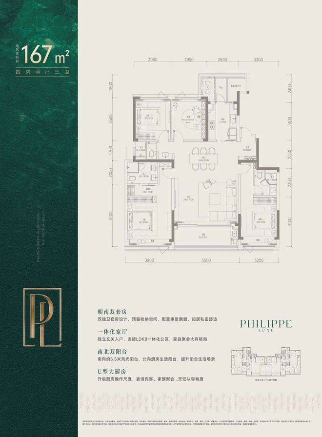 而建面约167㎡则是四房三卫格局,双套房设计,约40㎡的剧院式横厅,客餐一体,气场全开。市北、滨江的不少改善家庭,都在等它上线。