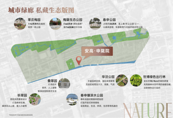 对于改善客户来说,绿色生态配套也非常吸引人。梅陇生态公园、莘庄梅园等,给安高申陇院业主带来静谧的生活环境。
