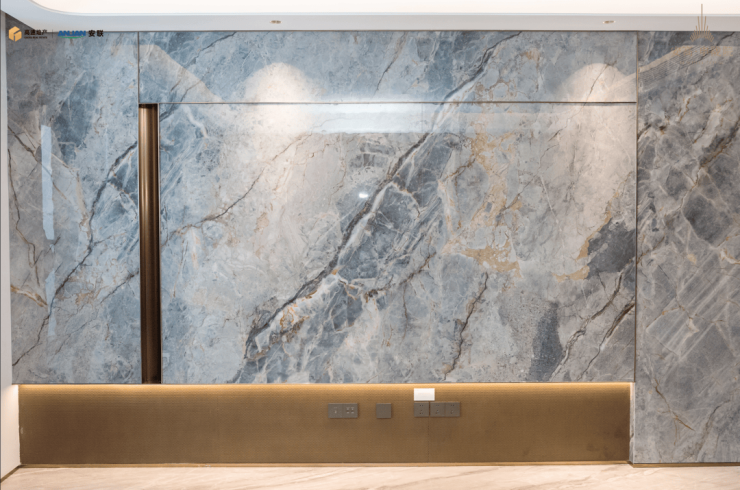客厅采用弧形转角的悬浮吊顶,无主灯设计非常吸睛,背景墙也是大块的岩板交付。