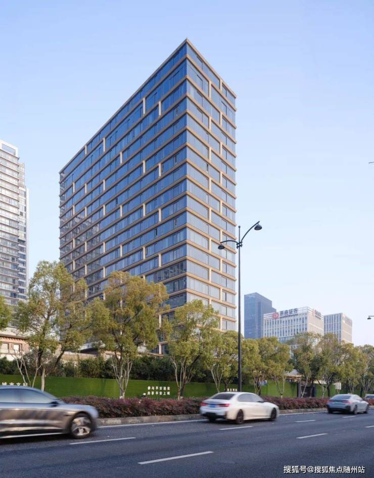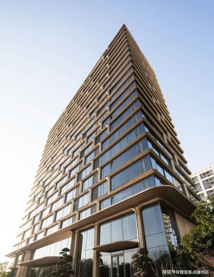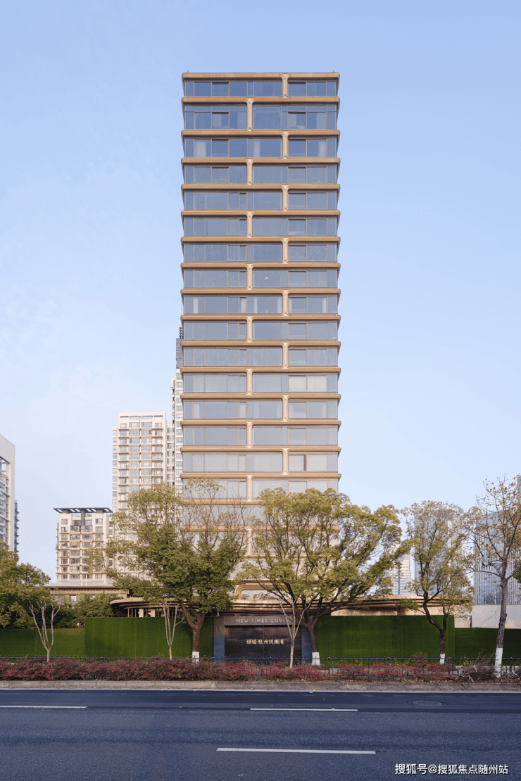 以“潮涌”为意象,立面设计提取钱塘江水的流动节奏,抽象为层层律动的香槟金色曲面铝板与大面玻璃系统交织的建筑语言。