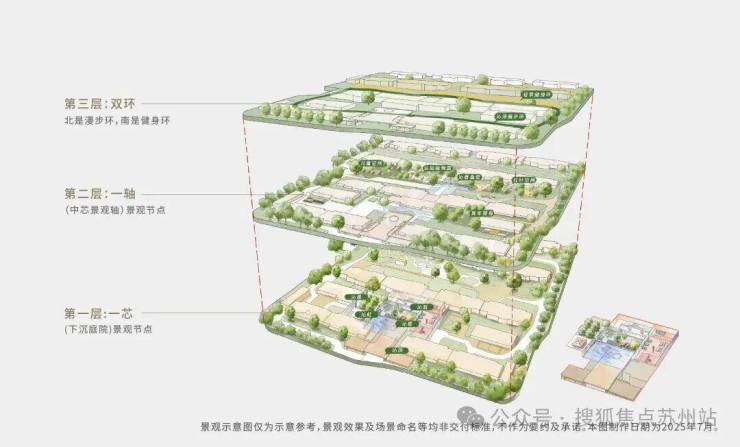 “立体景观芯”,下沉庭院复合型功能空间,非平面铺陈,目之所及皆是立体画境。