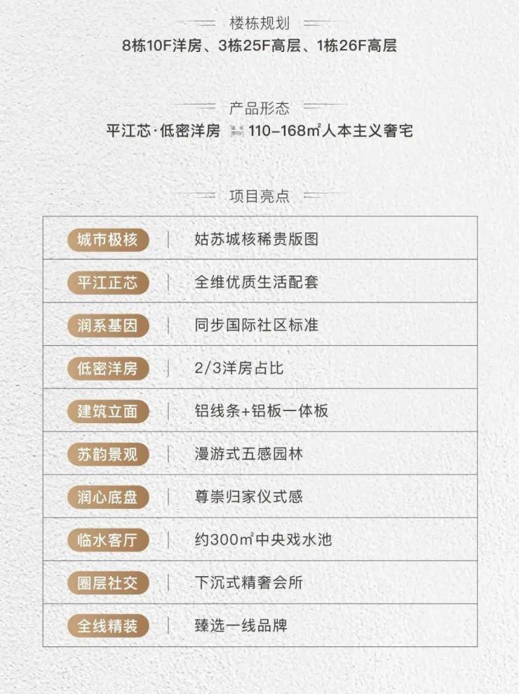 择址平江新城,姑苏新中心,润宸借鉴国际社区设计理念,规划12栋住宅,其中8栋约168㎡低密洋房、4栋约110㎡/144㎡光幕高层,凭借润系高阶作品对国际新锐生活的理解,以镜面美学立面、苏韵园林景观、万象服务产品服务力、润心会所文化、匠心精装产品,打造与平江共赴新的国际轻奢改善住区
