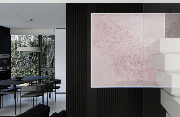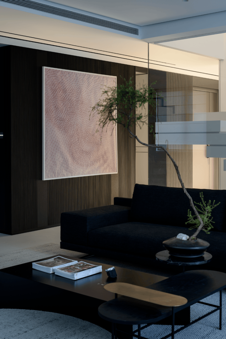 私密场域依旧保持静谧,黑白色基础上搭配了更多的色彩,例如深棕、浅紫等,艺术品的衬托深邃迷人,热络了家的氛围。