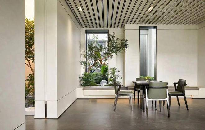 用料上,庭院两侧设计师选用大理石与镂空铝板虚实结合,利用2层柏翠造型铝线条错拼而成,更显精致;