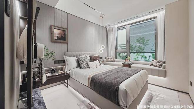 主卧和约99平户型一样,衣柜更大形成衣帽空间,还交付有半开放式、类似于酒店的迷你吧设计: