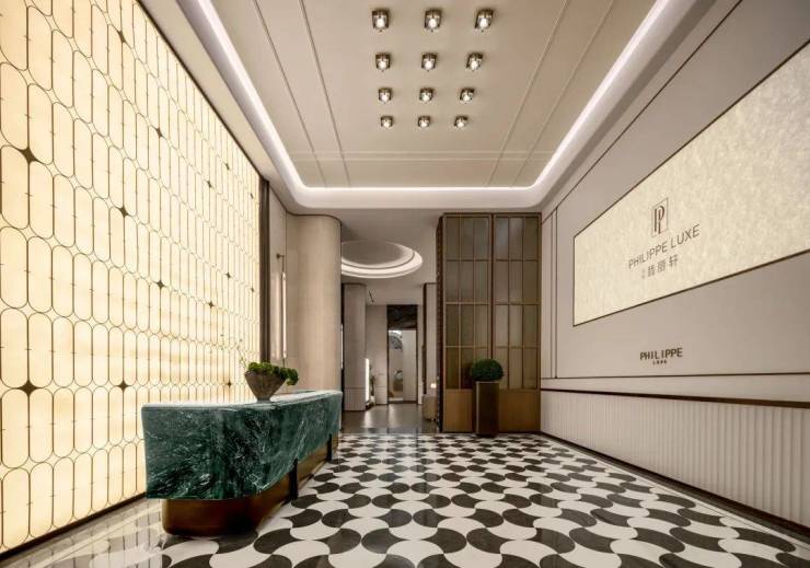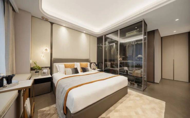 虽然体量不大,却舍得铺排气场。它定制了 璞丽酒店式的长廊门庭,别的楼盘在拼门头宽度,它在营造归家的“纵深仪式感”。