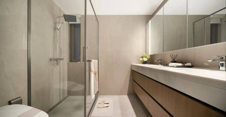 主次卫均配松下智能马桶,实现“ 智能马桶平权”。卫生间还有隐藏式暖风机、唯宝台盆、汉斯格雅龙头与花洒,件件是高端改善盘的常客。