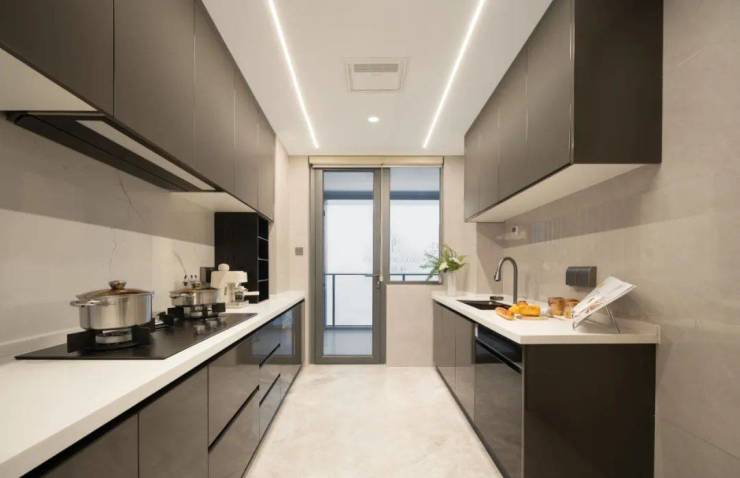 16项厨卫系统中,标配方太 全隐升降款油烟机、 三眼灶、 15件套洗碗机。顶上有奥普凉霸,灶台有岩板背景墙,不只实用,还细致关照厨房的“清洁动线”。
