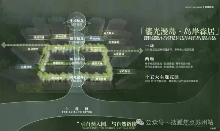 以“山水聚场”理念,规划“一环两轴十五园”景观布局,将水岸、岛屿、森林、花园、树屋作为园林节点,形成“行在景中、坐在岛中、游在林中、意在境中”的美学表达,营造出沉浸式山水活力场域。