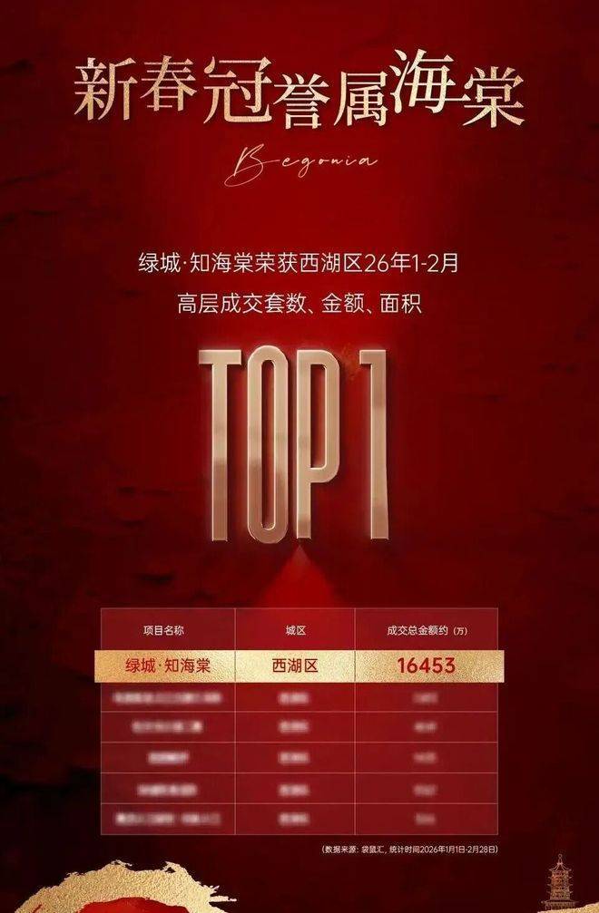 先看一组货真价值的网签数据:在刚过去的2026年1-2月,知海棠的成交套数、成交金额、成交面积,均位列西湖区高层住宅的TOP1。