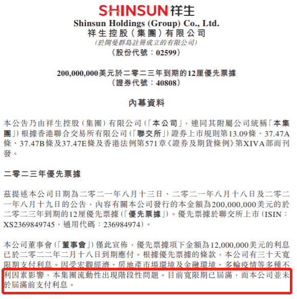 时间来到2022年3月21日,祥生控股集团发布公告称,公司未能按期支付2亿美元债的1200万美元利息。