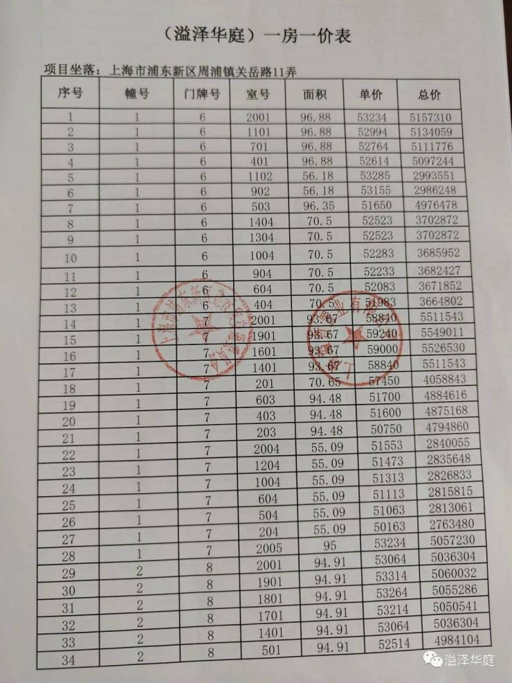 一房一价表如下: