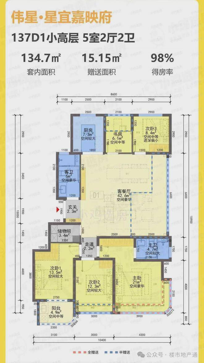 建面约137方边厅户型:罕见5房2厅2卫,得房率为98%,赠送面积高达17方。实际居住体验感相当于市面上的170方户型。