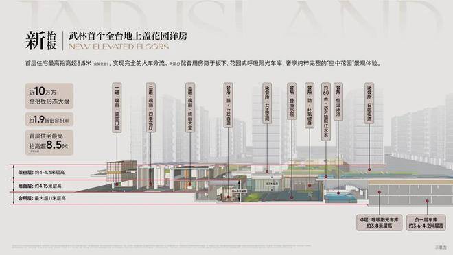 项目利用建筑新规创新设计「板块首个全台地上盖花园洋房」,整个小区通过约4.15米高的抬升,把“不利因素”隐藏起来,社区实现了彻底的人车分流。即便是洋房,2楼也相当于以往楼盘3-4楼高度,带来的是更优越的采光、通风,以及观景视野。