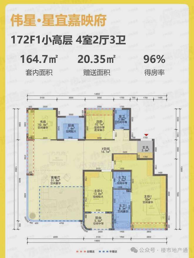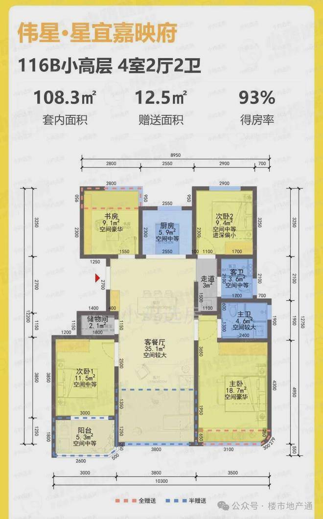 首开建面约116方的户型:4房2厅3卫,得房率为93%。类四叶草户型,南北通透、动静分明,每个房间都各有私密,互不打扰。