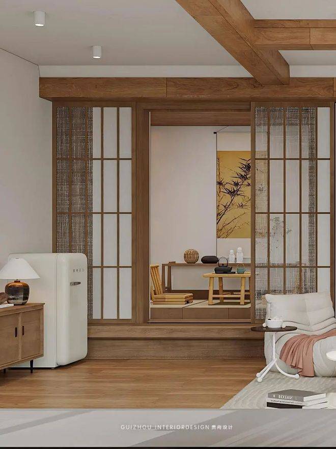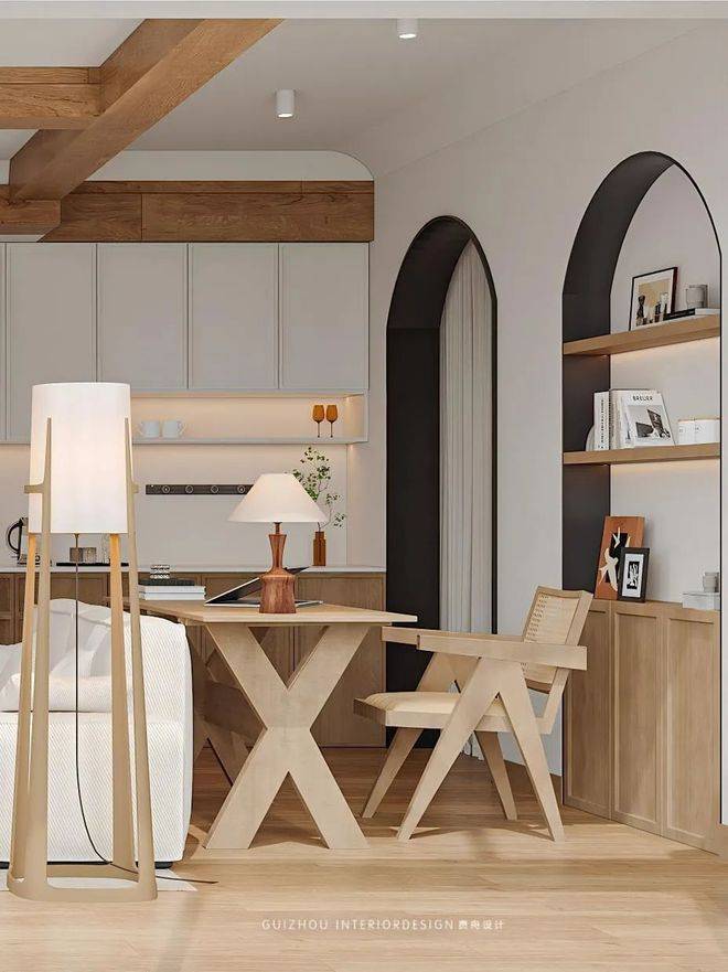 整体原木色主调搭配灰色素雅软装,是禅意与烟火气完美交融。