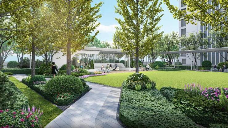 两处景观连廊+三大园林景观区,生活的列车从中庭户外会客空间「启程」,迎宾树阵+中庭水景,三重归家礼序伊始。