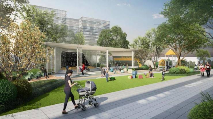 「归站」则是儿童活动乐园,从婴儿车停放区、认知墙到趣味滑梯再到蹦床秋千,满足全年龄段孩子需求。