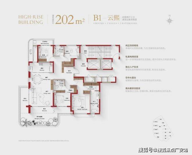 再来看看户型设计,完美呼应了四代宅的超高使用率,空中露台、阳台等各项数据的尺度非常惊人。