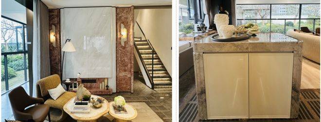 不仅门头处以奢石点缀,主入口礼仪归家水景采用手工整打安哥拉黑水景、黑金砂花岗岩铺装,次入口礼仪景墙也采用贝金米黄莱姆石,尊崇仪式感满满;