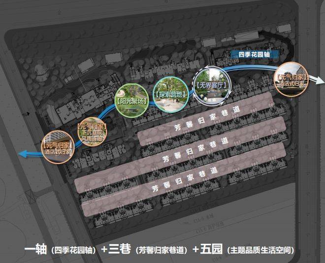 项目以「一轴-三巷-五园」为主题,打造约2.5万㎡尊享园林,营造“可漫步,可沉浸,可对话”的自然花园。