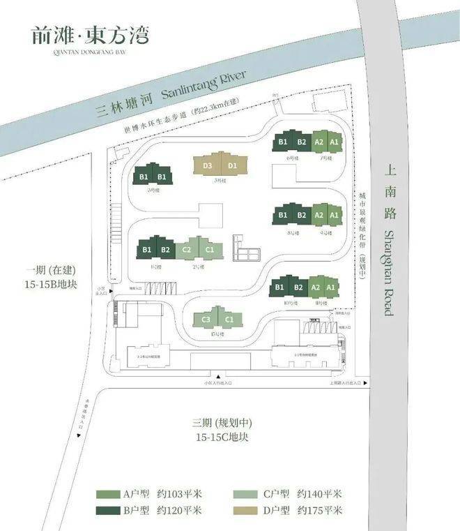 浦东三林永泰三里城二期定名「前滩·东方湾」该项目容积率2.0,拟建16-17F高层,可售商品房364户,保障房48户,自持房136户。