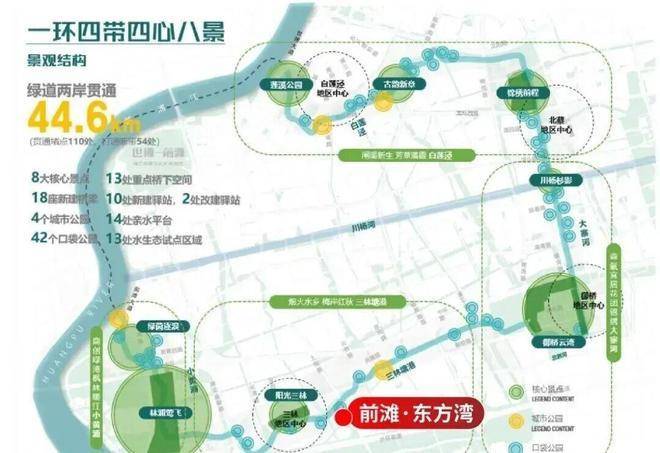 周边前滩友城公园、前滩体育公园、东明公园等已建成公园,三林塘港、“林浦莺飞”、“绿茵逐浪”等核心景点将连缀成片,形成气势磅礴的滨水公园带。