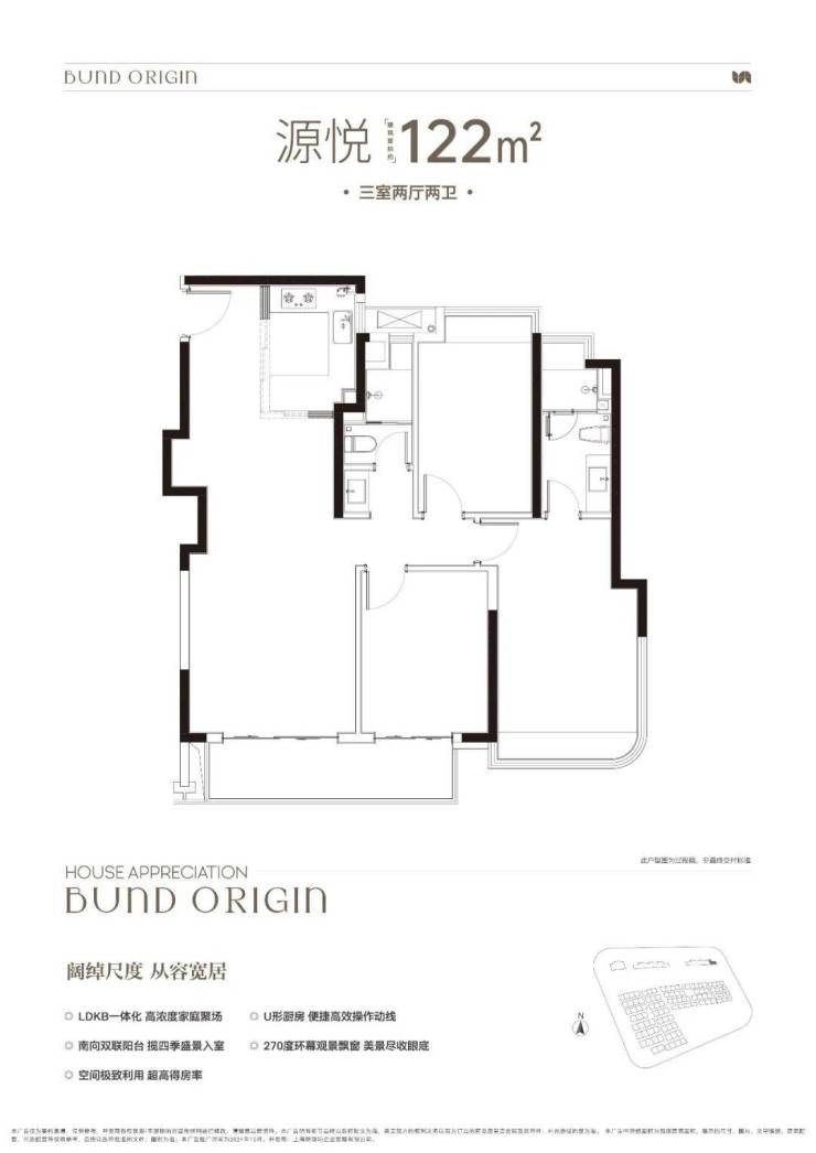 建面约122㎡3房2厅2卫,非常标准的动静分离、三开间朝南户型。