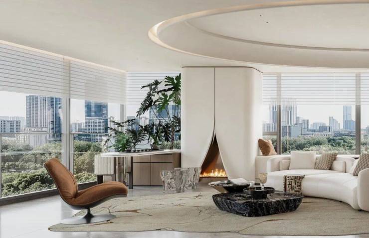 客厅以环幕弧形落地窗为主角,我们把沙发做成包裹感的柔润弧形围合,让居家的松弛栖居自然发生。奶油白的圆润体块感沙发,搭配一把焦糖弧形单椅作为 “视觉锚点”,轻轻拉开层次。