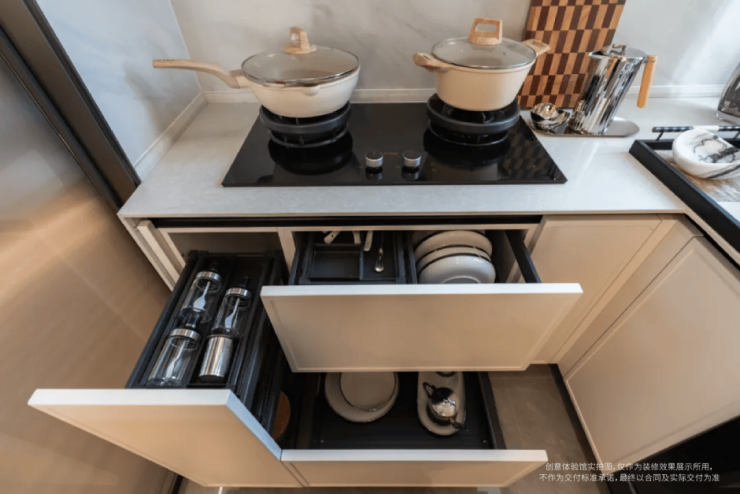 不管是小碗、大碗还是其他特殊餐具,都有不同的大小规格的抽屉可供整齐的摆放。让整个厨房的空间,得到充分的“扩容”。