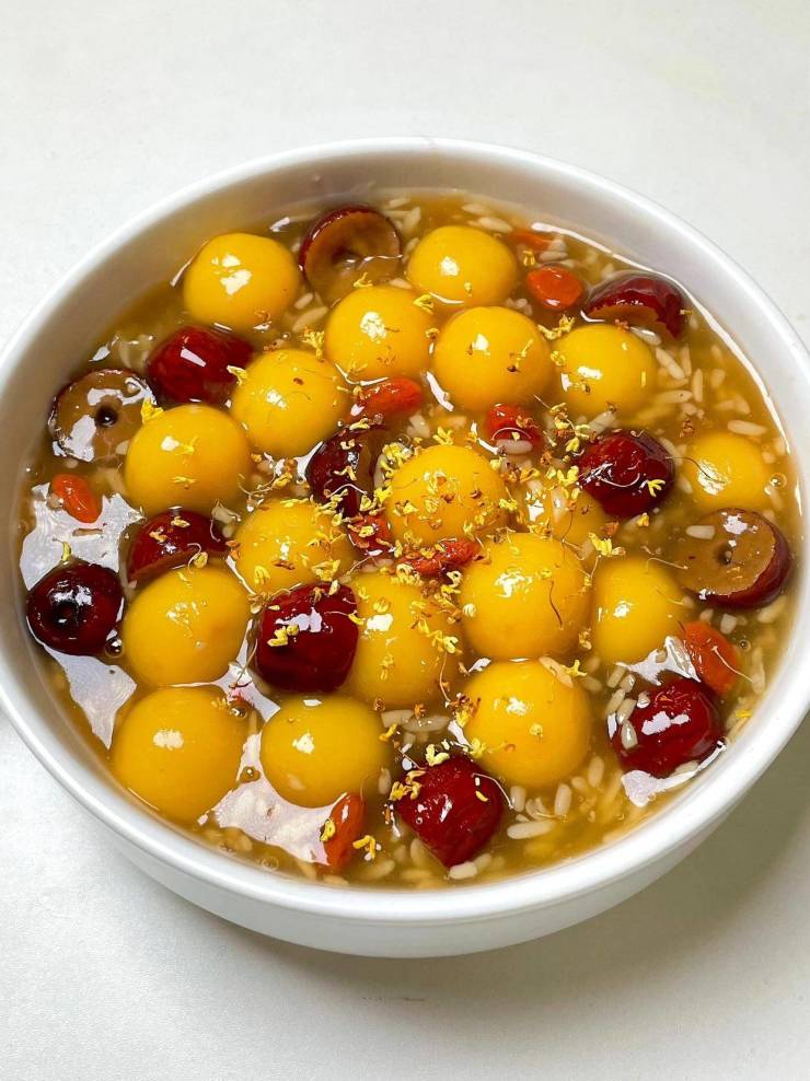 圆子是手工搓的,小巧玲珑,煮在酒酿里,加入少许桂花和冰糖。