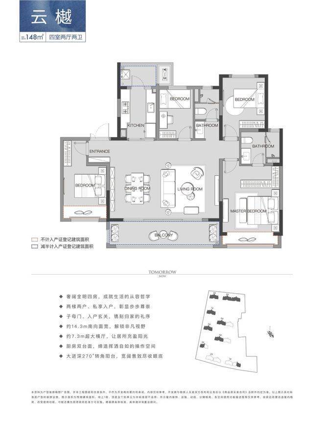 两梯两户、独立电梯入户设计,礼遇尊崇的归家仪式感。建筑面积约129-148㎡全改善户型,全生命周期享受,满足全家所需的空间场景;将光线充分加入空间设计,四开间朝南、大面宽、270°转角阳台等设计,让生活充分享受阳光的滋养;