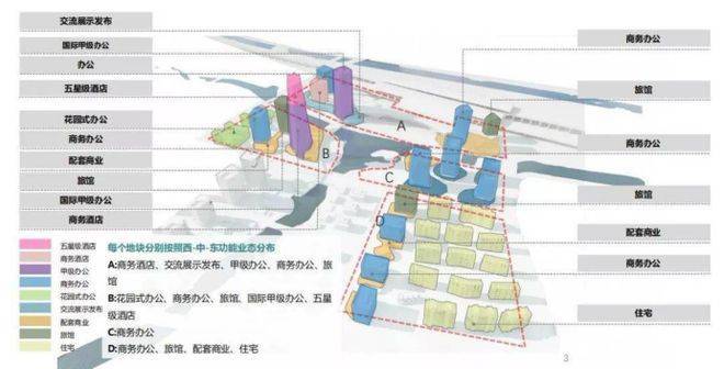 高铁新城TOD站前活力区,规划建面约129万㎡,包括商务酒店、甲级办公商务办公楼、旅馆、花园式办公楼、五星级酒店等丰富业态。