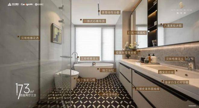 比如,日本东芝的中央空调,新风系统,德国博世的厨房六件套(含两台嵌入式冰箱),以及主次卫松下双智能坐便器,汉斯格雅五金,唯宝台盆等,而且厨房单独配置了东芝空调。