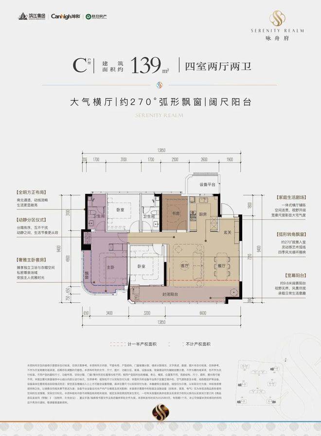 一款是四开间朝南的横厅户型,南向约13.85米的极致采光面,阳台也有约9.8米;动静分区,私密感超强;主卧套房带L型弧形转角飘窗,居住体感堪比全景舱。