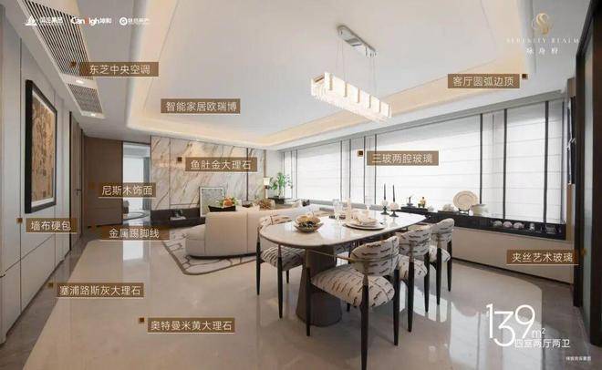 你看,餐客厅墙面选用天然尼斯木饰面。全屋共运用5种不同石材,如奥特曼米黄、塞浦路斯灰、意大利进口鱼肚金等。主卫台面为皇家白玉,公卫则选用白月光。