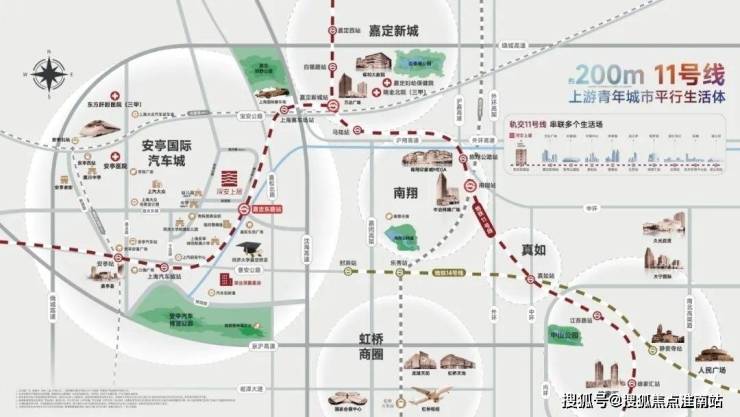 嘉定新城立足打通长三角一体化和虹桥国际开放枢纽的链接通道,构建“一核一枢纽、两轴四片区”的规划新格局。“一枢纽”即安亭枢纽——以安亭北站、安亭西站为核心,无缝连接虹桥国际开放枢纽,打造站城一体化、辐射长三角的综合交通枢纽。(信息来源:《嘉定新城总体城市设计》)除此之外,上海 2035 规划中的宝嘉线、嘉青松线即将启动,嘉安高速延展嘉定向东,与宝山互通,以安亭为枢纽核心,嘉定再次站在了时代发展的风口之上。